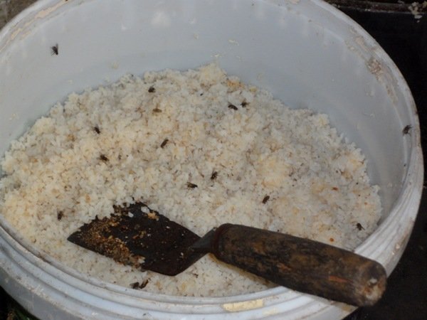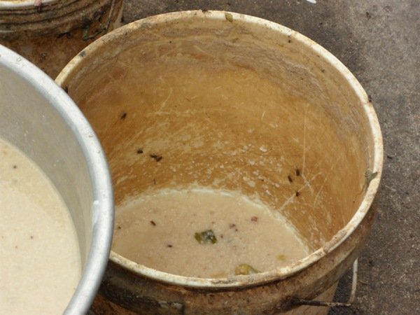 | Sau khi ủ men xong, những can đựng cơm trộn men rượu bám đầy bùn đất, phía trên ruồi nhặng bu đầy như thế này sẽ được đưa vào lò chưng cất thành rượu rồi được đem đi các nơi tiêu thụ. |