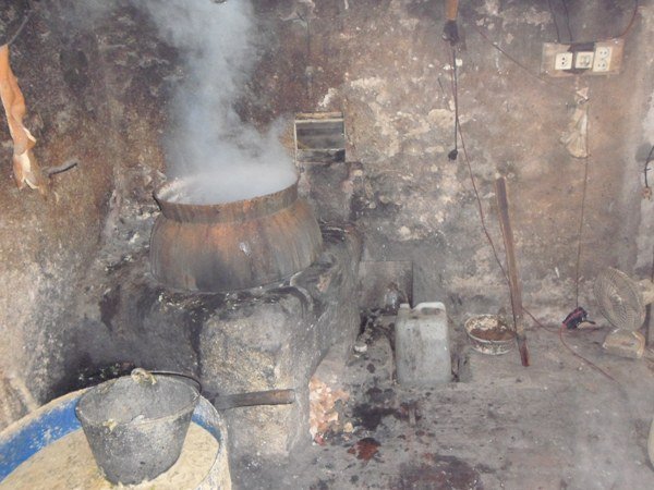 | Những chiếc nồi đồng chuyên dụng để nấu, chưng cất rượu trông cũng bẩn thỉu, nhếch nhác không kém. |