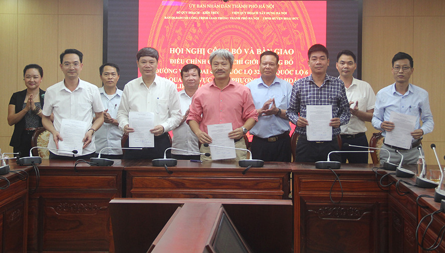 UBND huyện Hoài Đức phối hợp với Ban Quản lý dự án đầu tư xây dựng công trình giao thông TP Hà Nội vừa tổ chức hội nghị công bố và bàn giao chỉ giới đường đỏ đường Vành đai 4 - Vùng Thủ đô từ quốc lộ 32 đến quốc lộ 6, tỷ lệ 1/500.