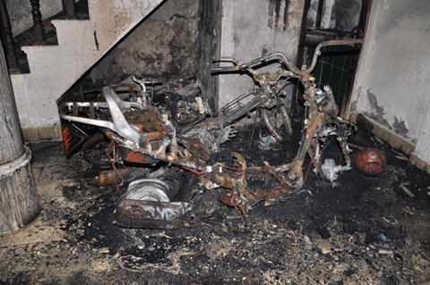 Hai chiếc xe máy Spacy và Viva cùng nhiều đồ đạc gia dụng để ở tầng 1 của gia đình anh M.T.N, ngách 251/10 Nguyễn Khang, Cầu Giấy, Hà Nội đã bị cháy rụi.