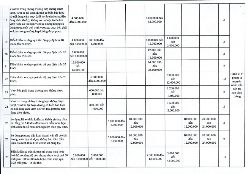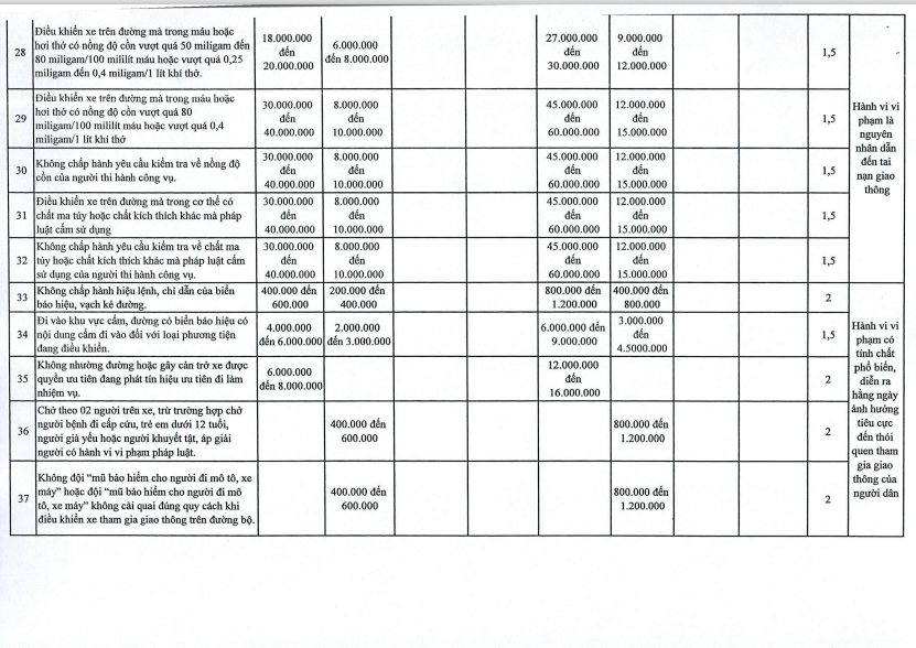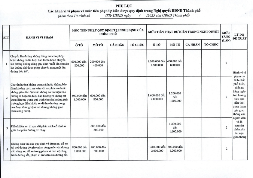 Theo đó, một số hành vi vi phạm giao thông theo quy định của Nghị định 168/2024 có mức phạt thấp nên đề xuất tăng 2 lần, còn những hành vi có mức phạt cao thì kiến nghị tăng 1,5 lần.