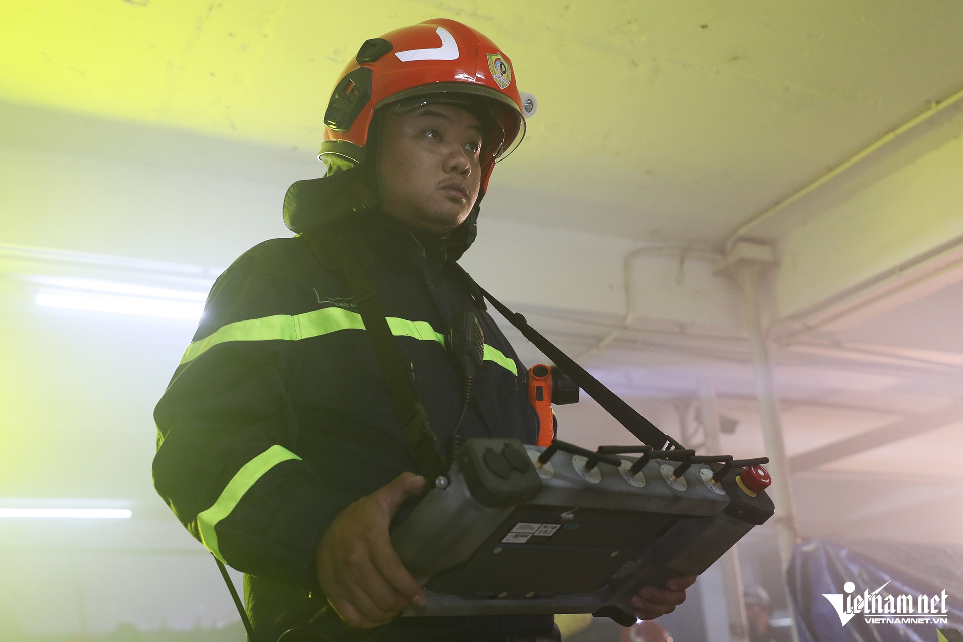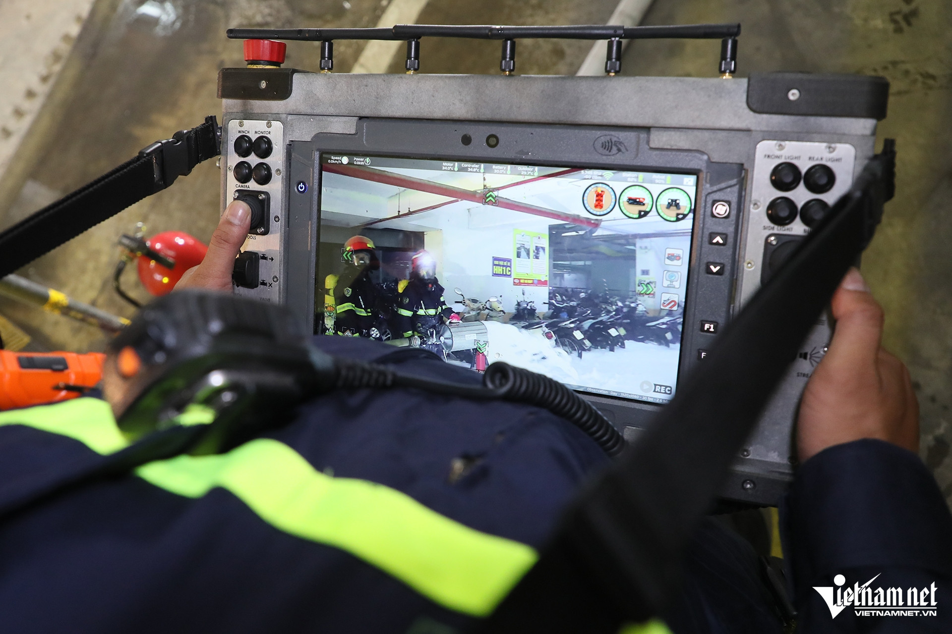 Đáng chú ý, lực lượng Cảnh sát PCCC&CNCH đã huy động cả robot chữa cháy tới hiện trường. Thiết bị này có trọng lượng 500kg, chiều dài 1,6m, chiều cao 0,68m và rộng 0,79m. Trên robot được trang bị hệ thống lăng giá điều khiển từ xa với lưu lượng phun 4.800L/phút, tầm phun xa 90m.