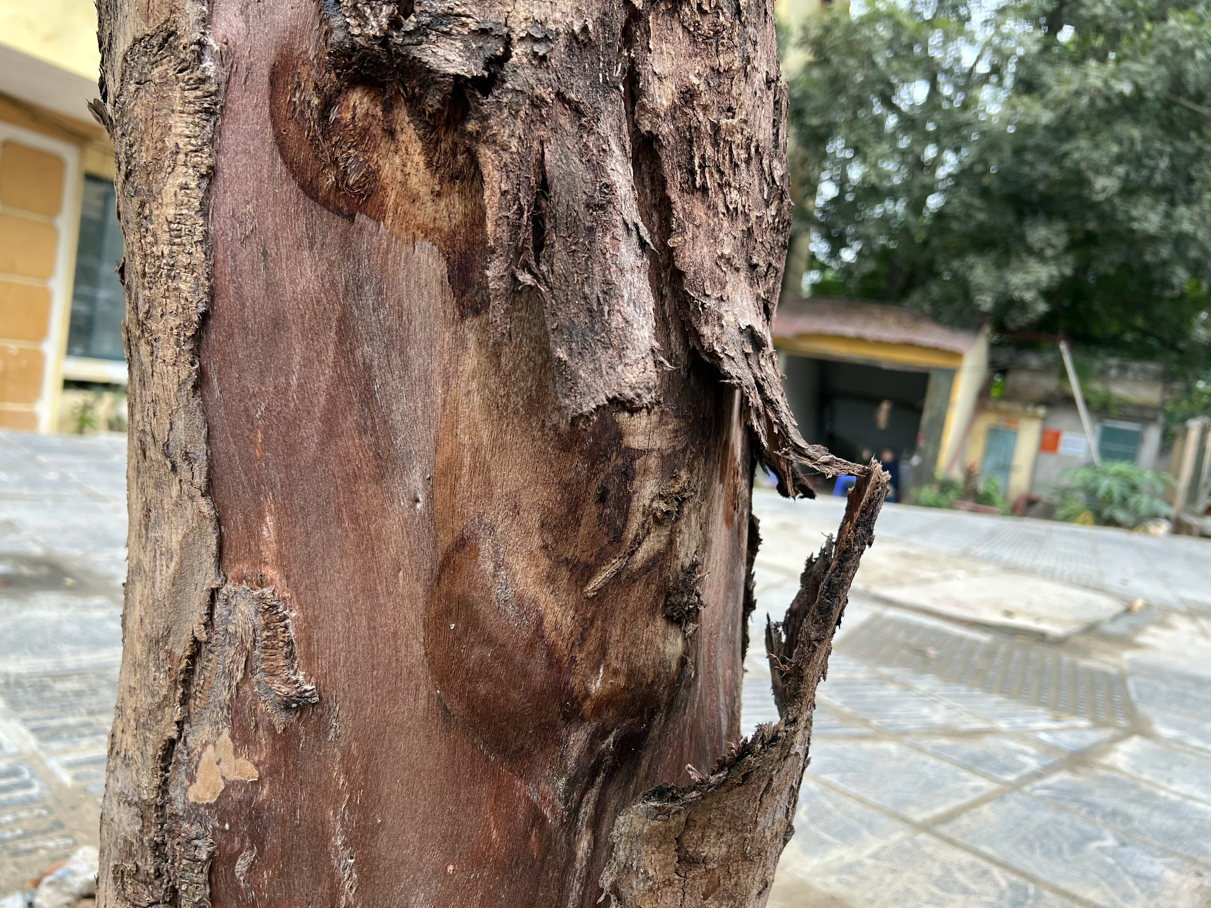Hàng cây trơ trụi trên đường Huỳnh Thúc Kháng kéo dài không cành, không lá, nhiều tháng nay được chống đỡ cẩn thận bằng cọc sắt. Trong đó, một số cây bị bong vỏ, lộ lớp thân gỗ khô bên trong.
