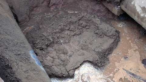 Hố “tử thần” (trước cửa số nhà 473 Nguyễn Trãi, quận Thanh Xuân, Hà Nội) rộng khoảng 4m, kéo dài đến hơn 12m, sâu hoắm. Xung quanh hố “tử thần”, mặt đường đã bị khoét sâu vào tạo thành hàm ếch. Nước vẫn lều phều pha trộn với cát ở phía dưới đáy hố “tử thần”.