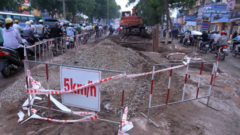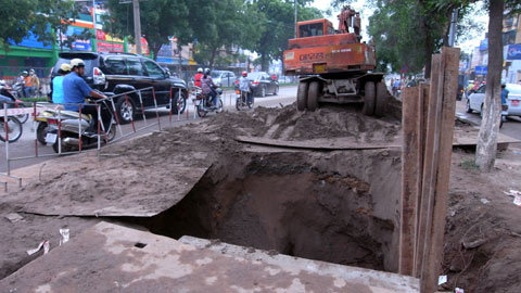 Đường Nguyễn Trãi đã hẹp, nay xuất hiên “hố tử thần” càng làm cho giao thông ùn, tắc vào giờ cao điểm. |