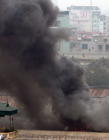 Hàng trăm người dân hiếu kỳ đã trèo các nóc nhà để xem việc chữa cháy.