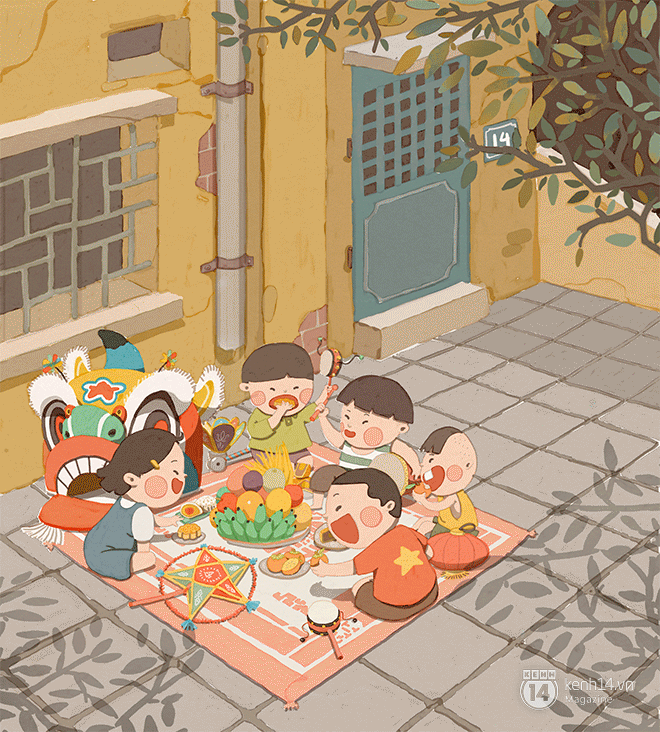 Trong khoảnh sân rất nhỏ thôi, bác Tổ trưởng tổ dân phố cùng mọi người kê một cái bàn mica đặt giữa sân, phủ tấm khăn trải bàn màu xanh, ở trên dĩ nhiên là những thức quà mùa Trung thu mà đứa trẻ nào cũng thuộc làu: Một con chó lông xù bằng bưởi, một đĩa hoa quả thật to mà tôi nhớ nhất là có nhiều quả hồng ngâm, chuối, rồi cốm non được bọc kín trong lá sen, rất nhiều kẹo và bánh quy, và dĩ nhiên là bánh nướng, bánh dẻo, rồi thì vài ba con lợn bánh nướng béo núc đặt trong giỏ đỏ - vàng.