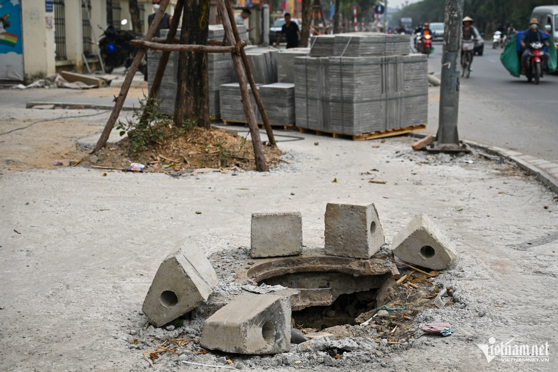 Hình ảnh tại phố Lê Trọng Tấn (quận Hà Đông), các kiện đá chất đống để chờ lát vỉa hè.