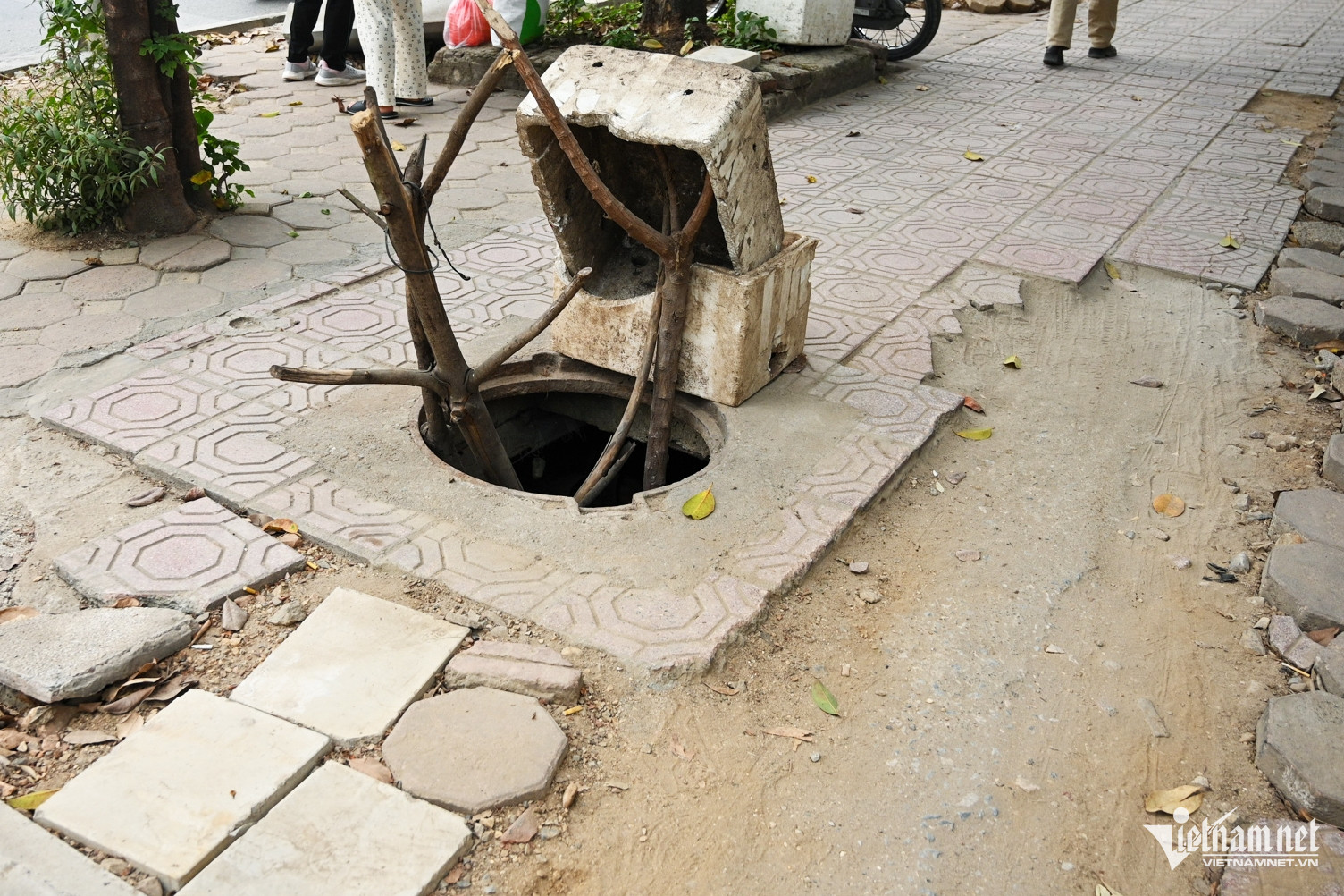 Xung quanh đó không có biển báo công trình đang thi công, không có che chắn và cảnh báo cho người đi đường.