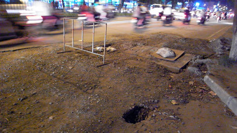Hiện trường là 1 hàng rào sắt cảnh báo người tham gia giao thông, xung quang hàng rào là 2, 3 lỗ sâu hoắm có đường kính khoảng nửa mét.