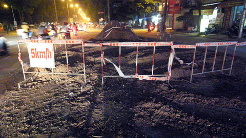 Người bán nước vỉa hè đường Nguyễn Trãi nơi gần hố tử thần cho biết: “Mấy chiếc hố xuất hiện cách đây 2 ngày, người dân đã lấy tạm hàng rào để cảnh báo nguy hiểm, chẳng thấy cơ quan chức năng đến kiểm tra xử lý gì cả”.