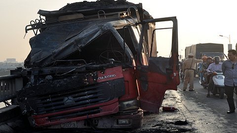 - Đang lưu thông đến đoạn giữa cầu Vĩnh Tuy bất ngờ tài xế chiếc xe tải