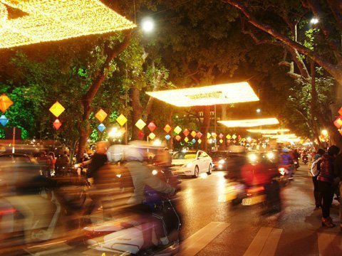 | Dòng người xe tấp nập quanh Bờ Hồ đón Giao thừa. |