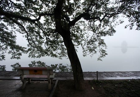 Sương mù giăng trắng mặt Hồ Gươm.