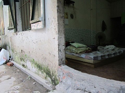 Tình trạng tường nhà nứt gãy cũng không phải hiếm trong các phòng trọ tại thủ đô. Th, sinh viên Trường ĐH Văn Hóa, đang trọ tại làng Thành Công đang phải đối mặt với sự nứt gãy của bức tường phòng trọ. Th. cho biết: “Ngày mưa, nước cứ gỉ theo vết gãy ấy mà loang nước ra nhà. Vôi vữa cũng được dịp mà vỡ ra. Không biết mình có thể ở lại đây cho tới khi nào, có lẽ cũng phải chuyển đi."