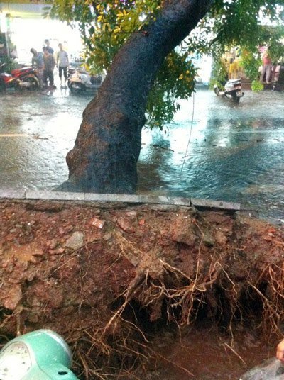 Trên phố Tây Sơn cũng có 1 cây đổ trước cổng Trường ĐH Thủy lợi. Trên phố Đào Duy Anh, trước cổng khách sạn Kim Liên có 2 cây lớn đổ chắn ngang đường khiến người tham gia giao thông phải đi đường vòng.