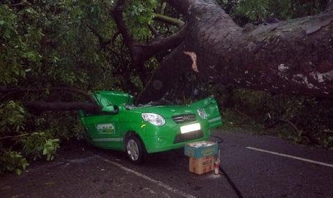 | Giông bão giật mạnh khiến 1 cột điện trên phố Trần Huy Liệu xảy ra vụ đổ cột điện, đổ cây đè nát, bẹp dúm chiếc taxi. Rất may, nhân viên lái taxi là anh Nguyễn Phú Tuấn đã may mắn thoát chết, chỉ bị thương tích nhẹ do các mảnh vỡ cửa kính xe găm vào - ảnh Anh Tuấn |