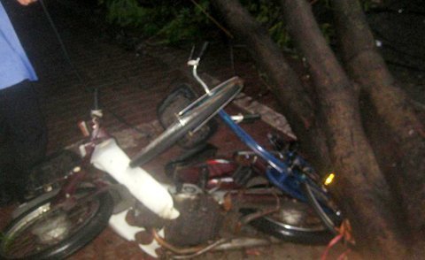 | Cây đổ trên phố Lò Đúc đè bẹp xe taxi Mai Linh khiến tài xế tử vong. Một số xe máy dựng cạnh đó cũng bị đè bẹp. (Ảnh: Phạm Hải) |