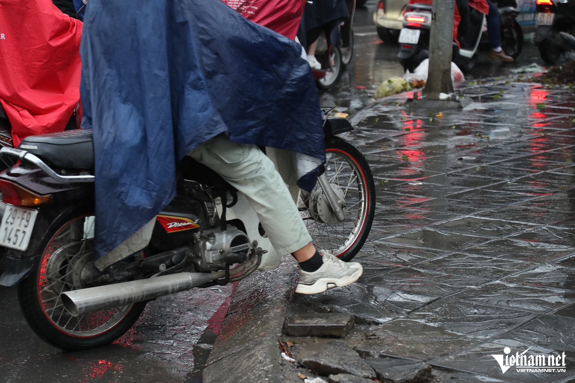 Sáng 18/2, nhiệt độ tại Hà Nội giảm, ở ngưỡng 15 - 16 độ C kèm theo mưa phùn. Người dân đi làm phải mặc áo mưa, di chuyển rất khó khăn qua các đoạn đường ùn tắc dài.