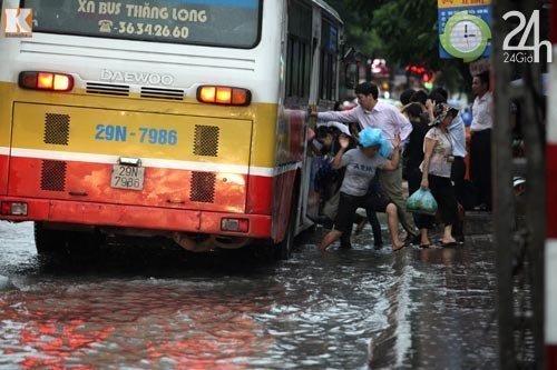 Người dân chật vật bắt xe buýt trong lúc ngập úng (Ảnh: 24h)
