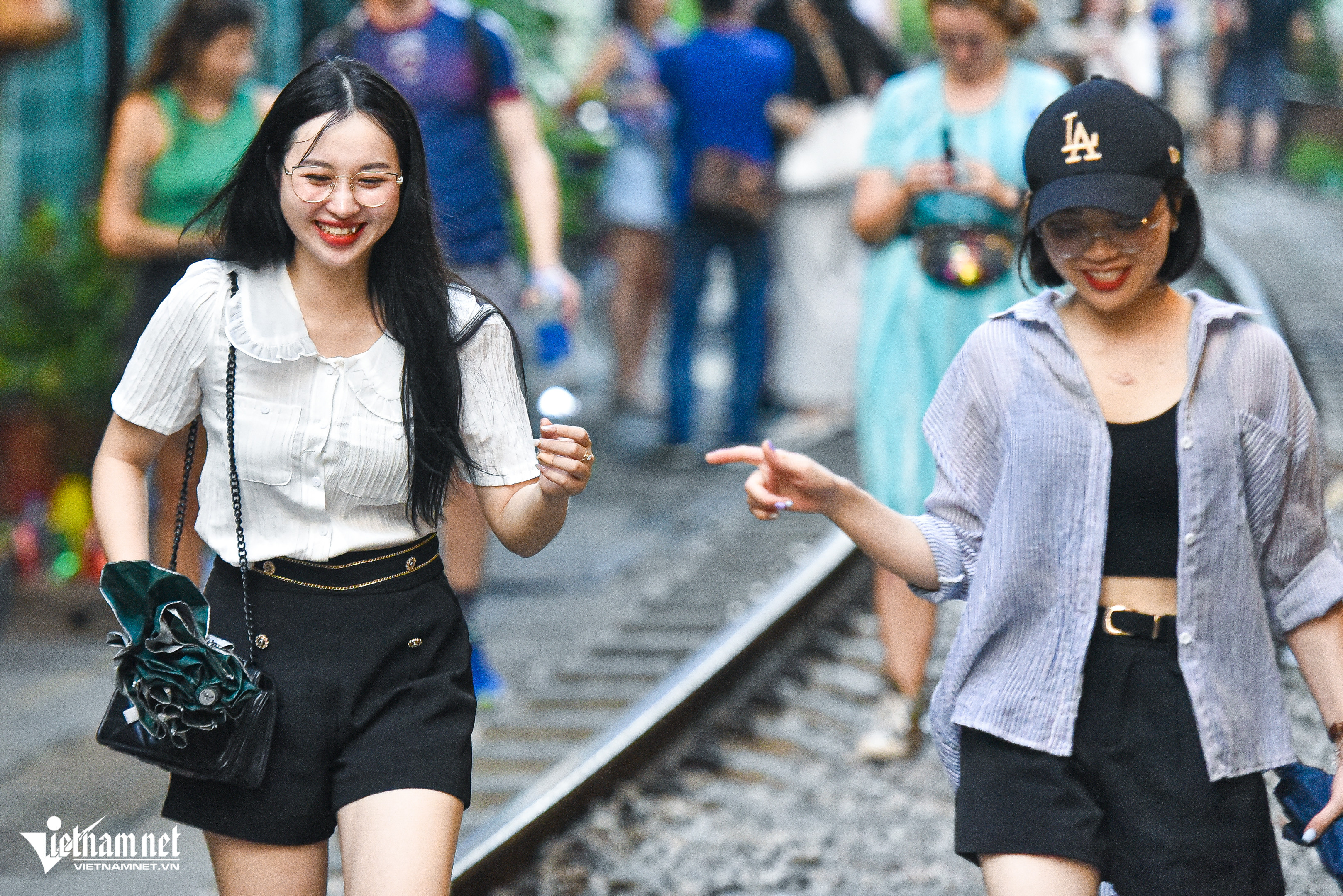 Thời điểm không có tàu chạy qua, du khách quốc tế thích thú trải nghiệm cảm giác chụp ảnh giữa đường ray