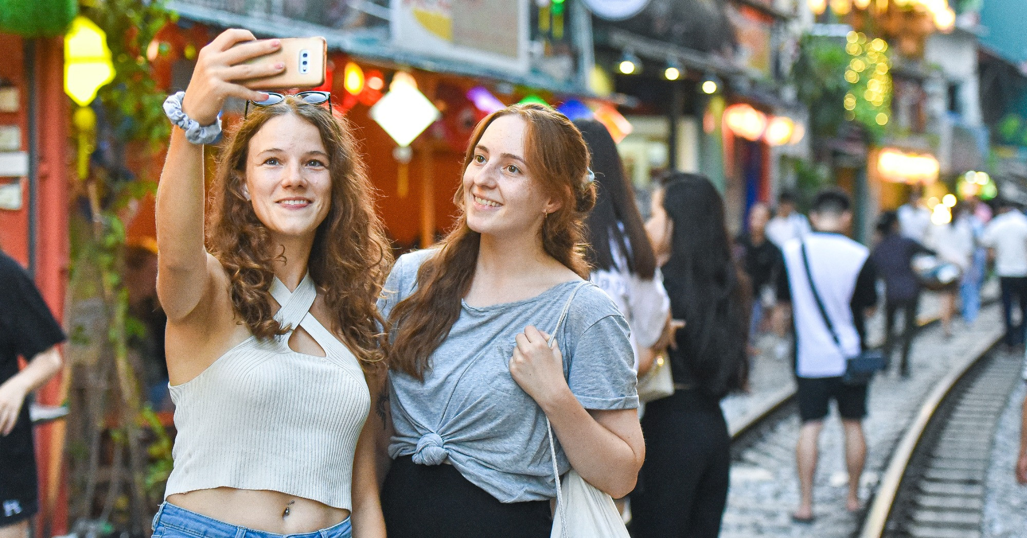 Dù chỉ có ít giờ ở Hà Nội trước khi di chuyển tới Sa Pa, hai du khách người Tây Ban Nha vẫn dành thời gian trải nghiệm khu phố đường tàu. "Chúng tôi từng nhìn thấy nơi này xuất hiện rất nhiều trên mạng xã hội. Khi tới đây, tôi cảm thấy phấn khích. Tôi hy vọng mình kịp chờ khoảnh khắc tàu chạy đến trước khi phải rời đi", nữ du khách cho biết"Đây là lần đầu tiên mình tới phố đường tàu Hà Nội. Không khí nhộn nhịp, sôi động hơn mình tưởng tượng. Xung quanh là rất nhiều hàng quán bày biện đẹp mắt và nhiều du khách quốc tế", Phạm Hương Trà (áo trắng), du khách tới từ Bắc Giang chia sẻ