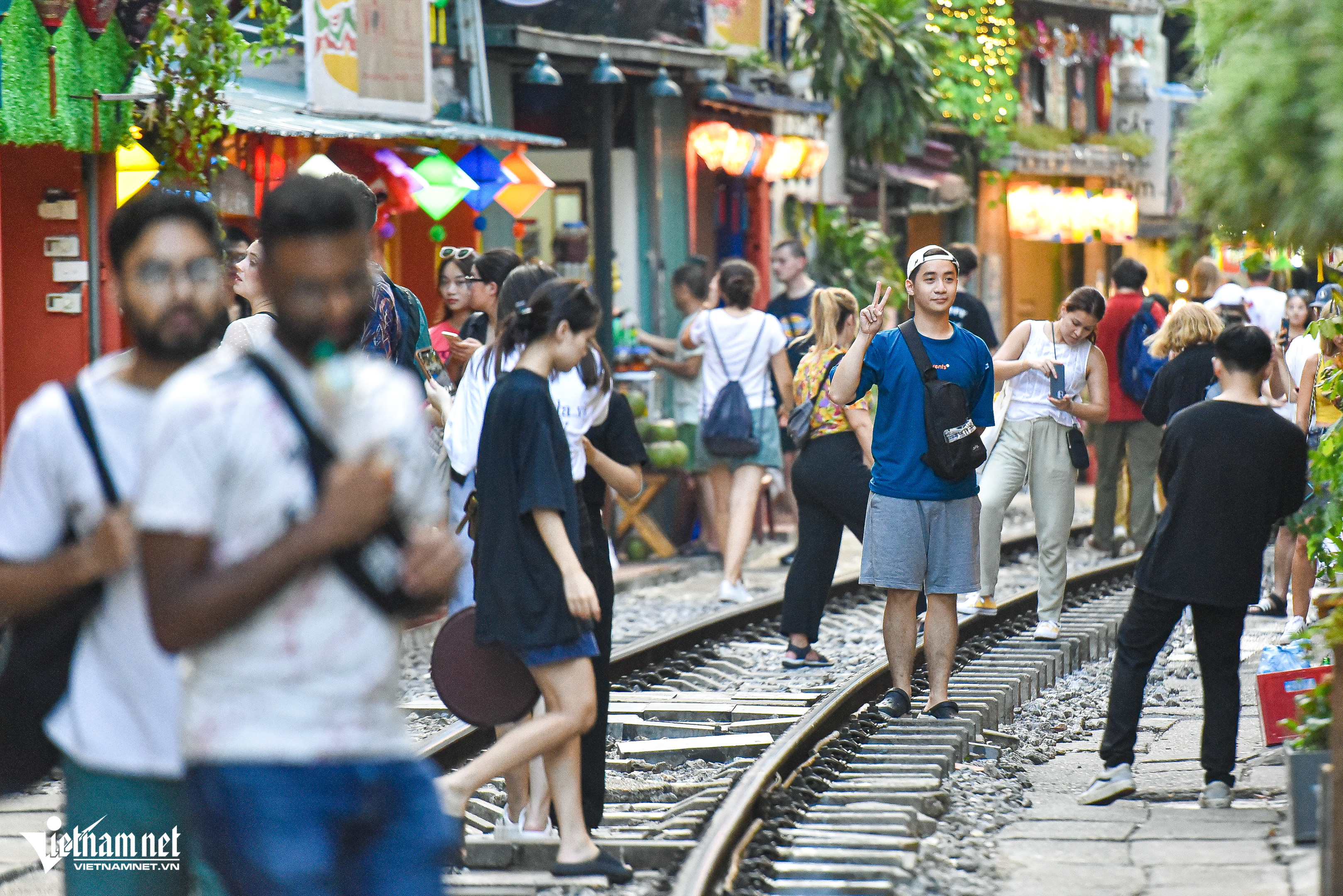 Khi được nhân viên đường sắt và các chủ cửa hàng thổi còi báo hiệu, phát loa thông báo có tàu gần tới, du khách sẽ di chuyển tới một vị trí an toàn trong quán, sẵn sàng cầm điện thoại để ghi lại khoảnh khắc tàu chạy quaCó thời điểm trời đổ mưa nhưng du khách vẫn "đội mưa" chụp ảnhTheo người dân địa phương, những ngày lễ hay cuối tuần, số chuyến tàu chạy qua đây nhiều hơn, tạo điều kiện cho du khách "săn" ảnh độc đáo. Chủ hàng quán sẽ theo dõi lịch tàu chạy để căn thời gian thông báo, nhắc nhở du khách giữ an toànTrước đó, vào tháng 10/2019, UBND TP Hà Nội đã yêu cầu xử lý dứt điểm các hành vi vi phạm trật tự an toàn giao thông đường sắt, ngăn chặn giải tán các điểm tụ tập đông người, ngồi uống cà phê trong lòng đường sắt. Việc đóng cửa hàng quán tại đây đã gây ra nhiều ý kiến trái chiều. Cộng thêm ảnh hưởng của dịch Covid-19, trong thời gian dài, khu phố đường tàu vắng bóng du kháchCách phố đường tàu không xa, phố Hàng Mã cũng là điểm đến thu hút rất đông du khách trong ngày đầu tiên của kì nghỉ lễ. Từ 18h, dòng người nối đuôi nhau vào ngắm, mua các mặt hàng Trung thu, chụp ảnh... Nhiều thời điểm, con phố tắc cứng, người chen ngườiRất nhiều gia đình đưa trẻ em tới Hàng Mã để tìm mua đồ chơi. Du khách nên mang theo quạt cầm tay để giảm bớt nóng bức cho các bé
