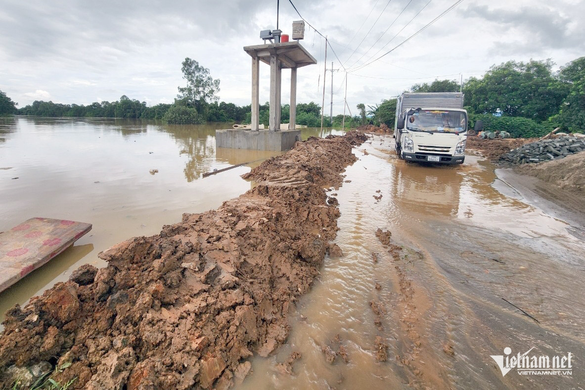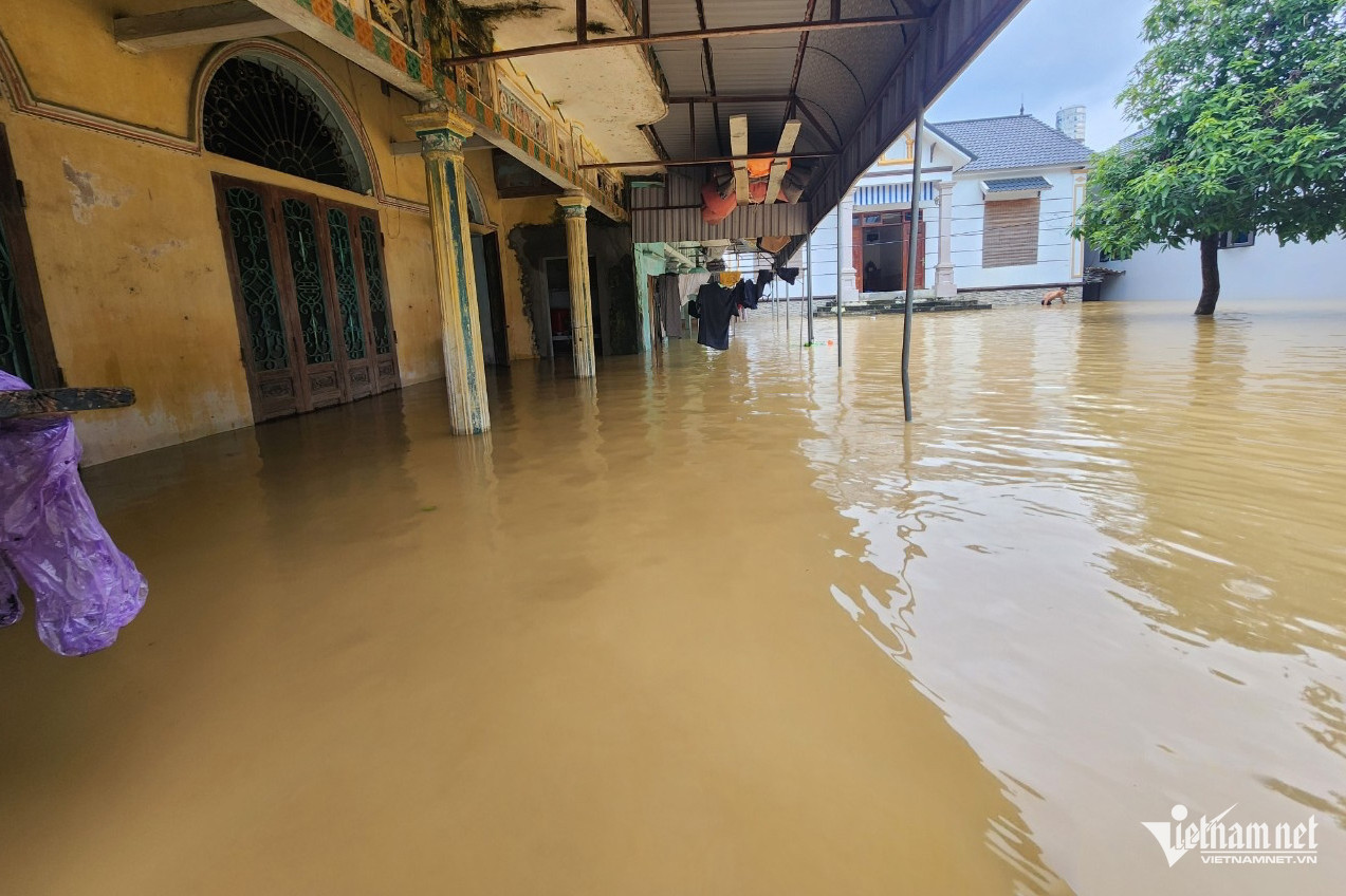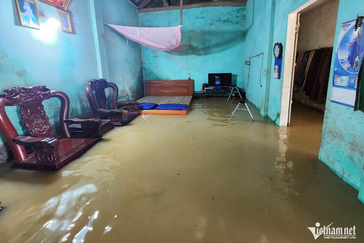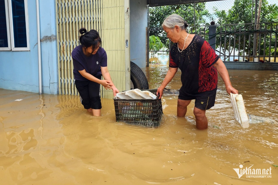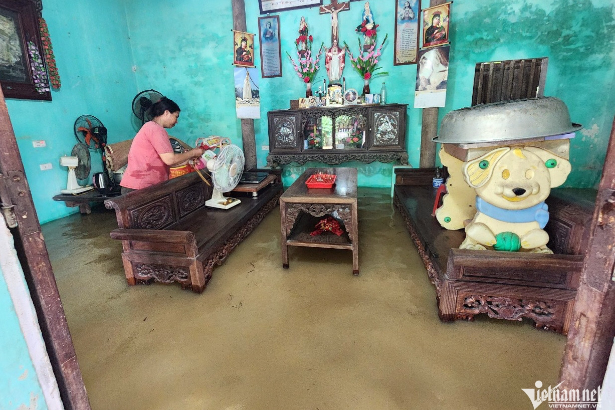 Đêm 23/7, bà Ngô Thị Mùi (72 tuổi, xã Tân Tiến) không thể nào chợp mắt, lòng như “lửa đốt” vì trời vẫn mưa tầm tã nhiều ngày không ngớt. Sau nhiều lần thấp thỏm dậy ra phía vườn giáp sông Bùi, khoảng 5h ngày 24/7, bà Mùi vội vàng gọi con cháu dậy chạy lũ, đưa tài sản lên khu vực cao hơn vì thấy nước dâng cao ào ào, ngập nhà kho và khoảng sân trước nhà.