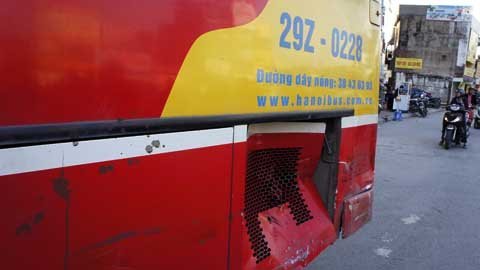 | Phần hông bên trái chiếc xe buýt bị móp nhẹ |