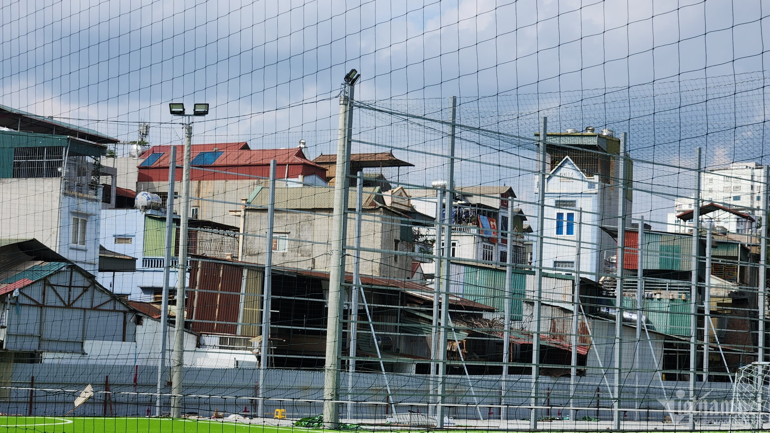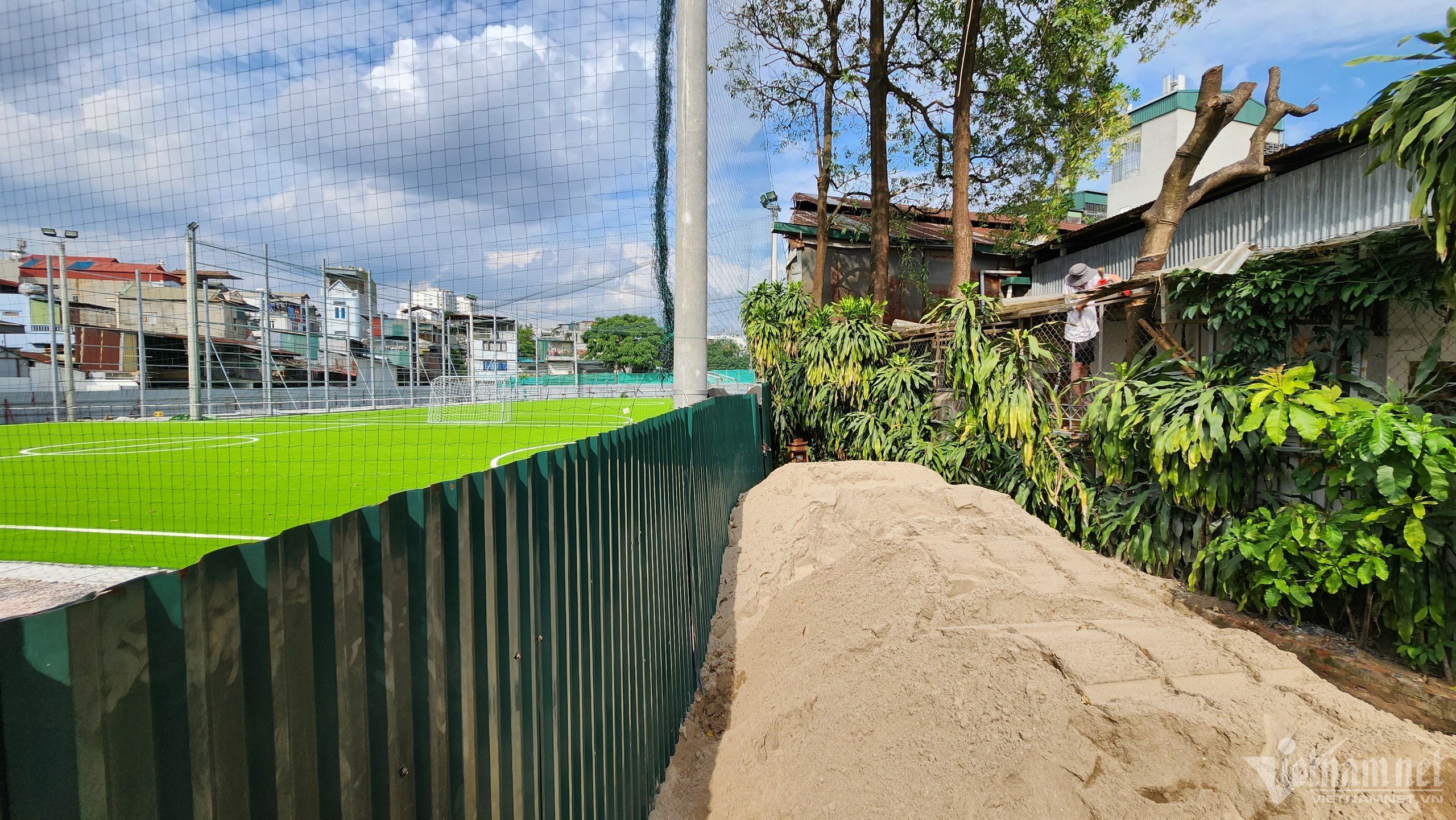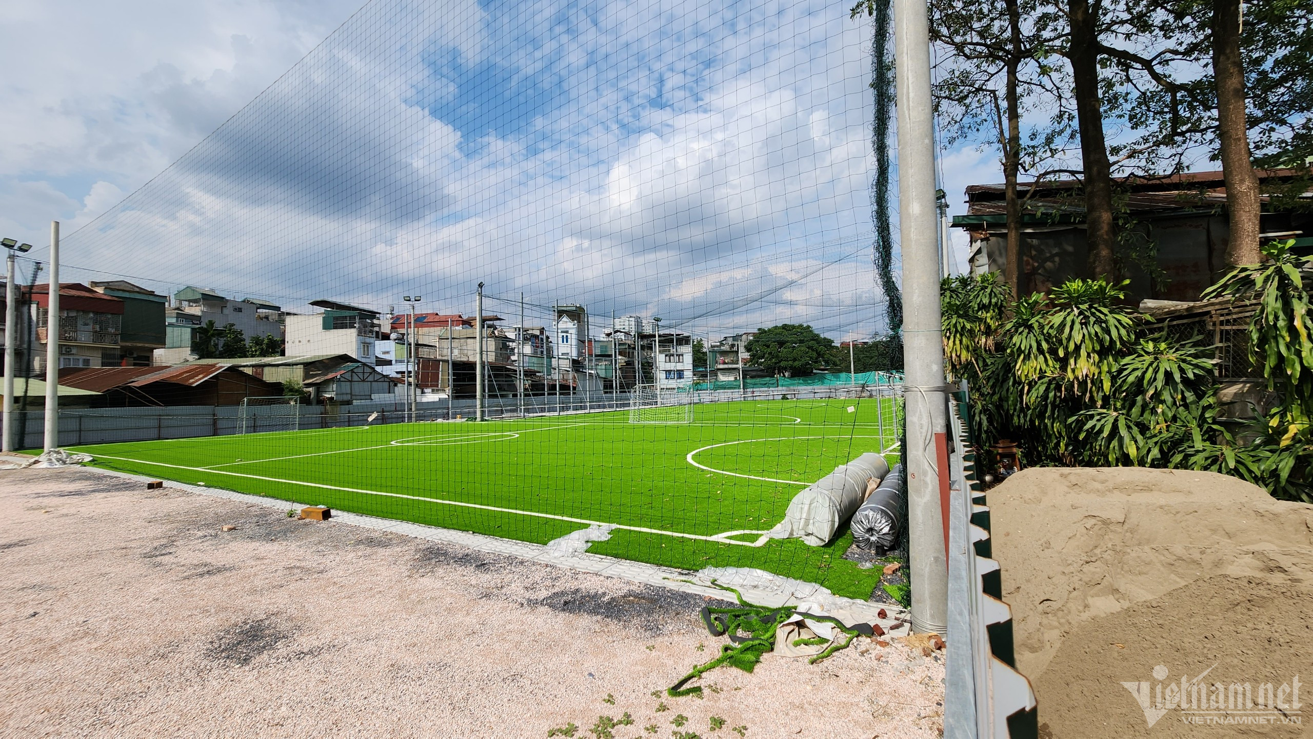Ghi nhận của PV VietNamNet ngày 12/5 tại ngõ 345 Khương Trung cho thấy, sân bóng nhân tạo nằm lọt bên trong khu đất được quây tôn bao quanh. Hạ tầng xây dựng gồm hệ thống cột điện cao áp, lưới chắn bóng và mặt sân cỏ nhân tạo cùng các hạng mục khác.