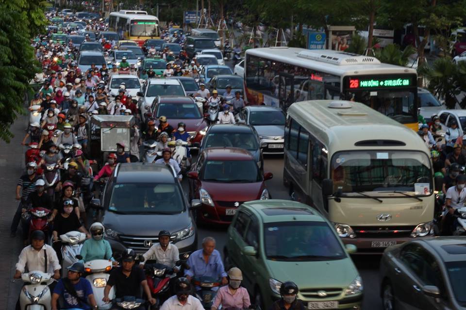 Phía ngoài khu vực bến xe, đường Giải Phóng rất đông các phương tiện. Ảnh: Nhị Tiến |