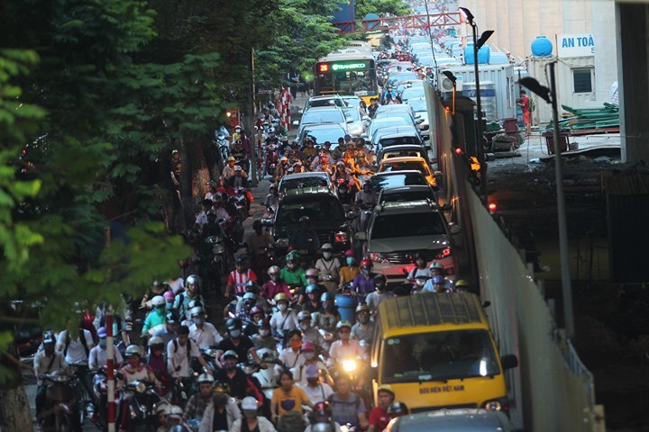Đường Nguyễn Chí Thanh, các phương tiện ùn dài từ lúc 17h. Ảnh: Đoàn Bổng |