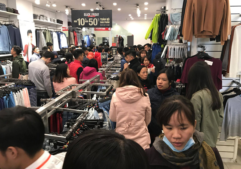 Hàng nghìn người chen chân mua sắm tại các trung tâm thương mại, shop thời trang,... nhân ngày Black Friday. Các cửa hàng đông nghịt khách, xếp hàng cả tiếng chờ đến lượt thanh toán, còn đường phố thì tắc nghẽn.