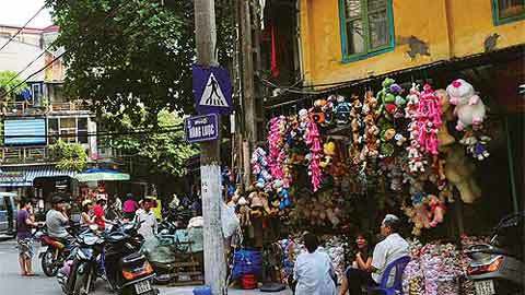 Một cảnh đường phố nhộn nhịp thường thấy ở Hà Nội. Các chủ cửa hàng bày