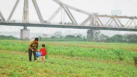 Hai cha con đang gieo hạt trên cánh đồng dưới chân cầu Long Biên. Cây cầu