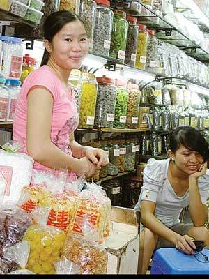Phố Hàng Đường gần chợ Đồng Xuân, nơi có nhiều cửa hàng bán bánh kẹo.