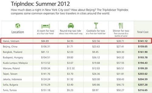 Theo chỉ số TripIndex 2012 do trang web du lịch nổi tiếng TripAdvisor (Mỹ) vừa công bố, Hà Nội là thành phố du lịch rẻ nhất cho các du khách trong mùa Hè 2012 (từ 1/6 đến 31/8) trong số các thành phố của 48 quốc gia đón nhiều khách du lịch quốc tế nhất thế giới.