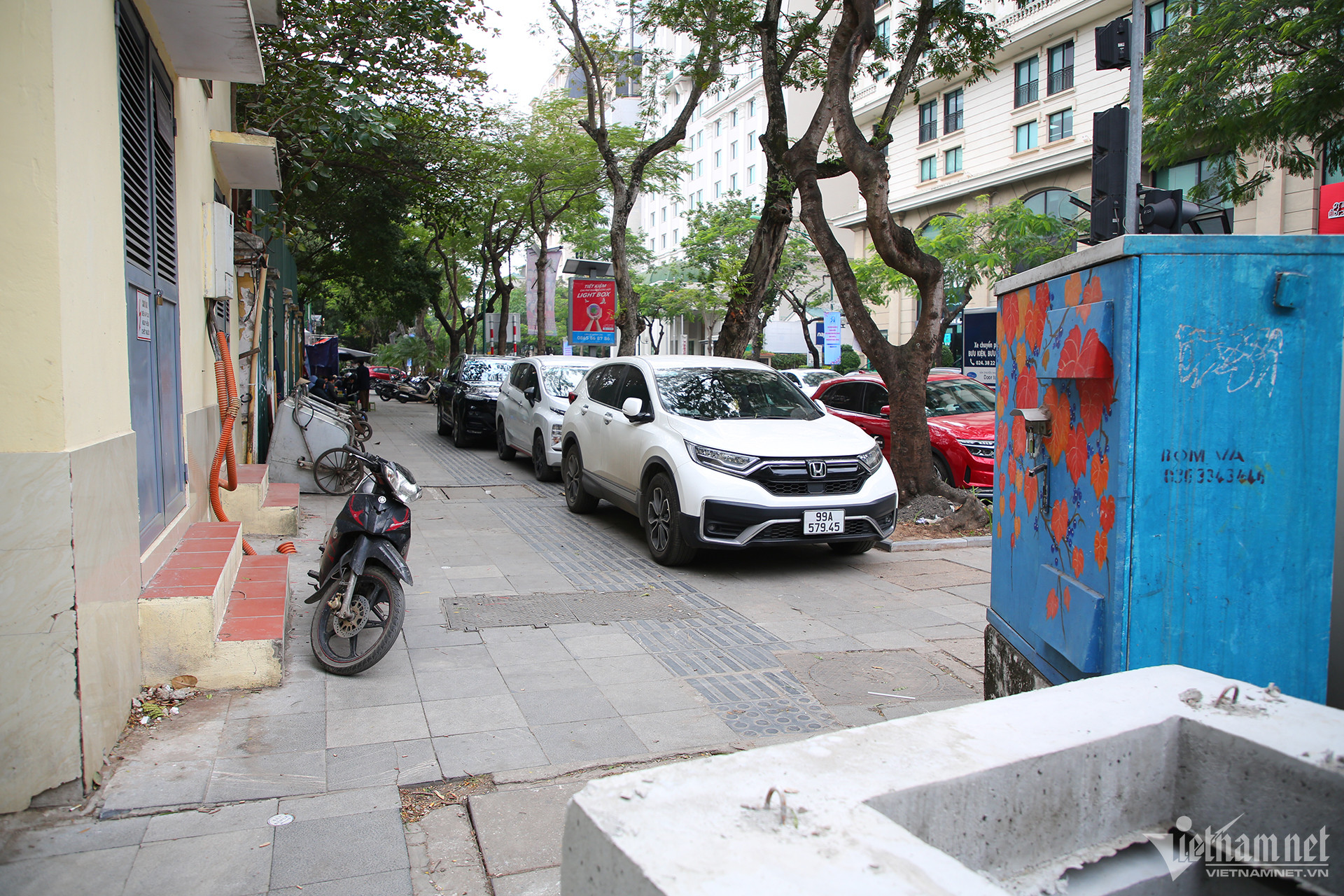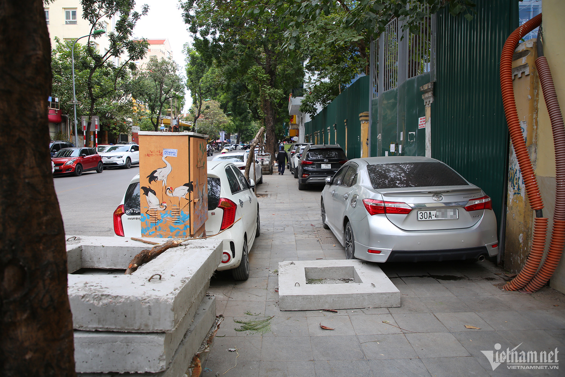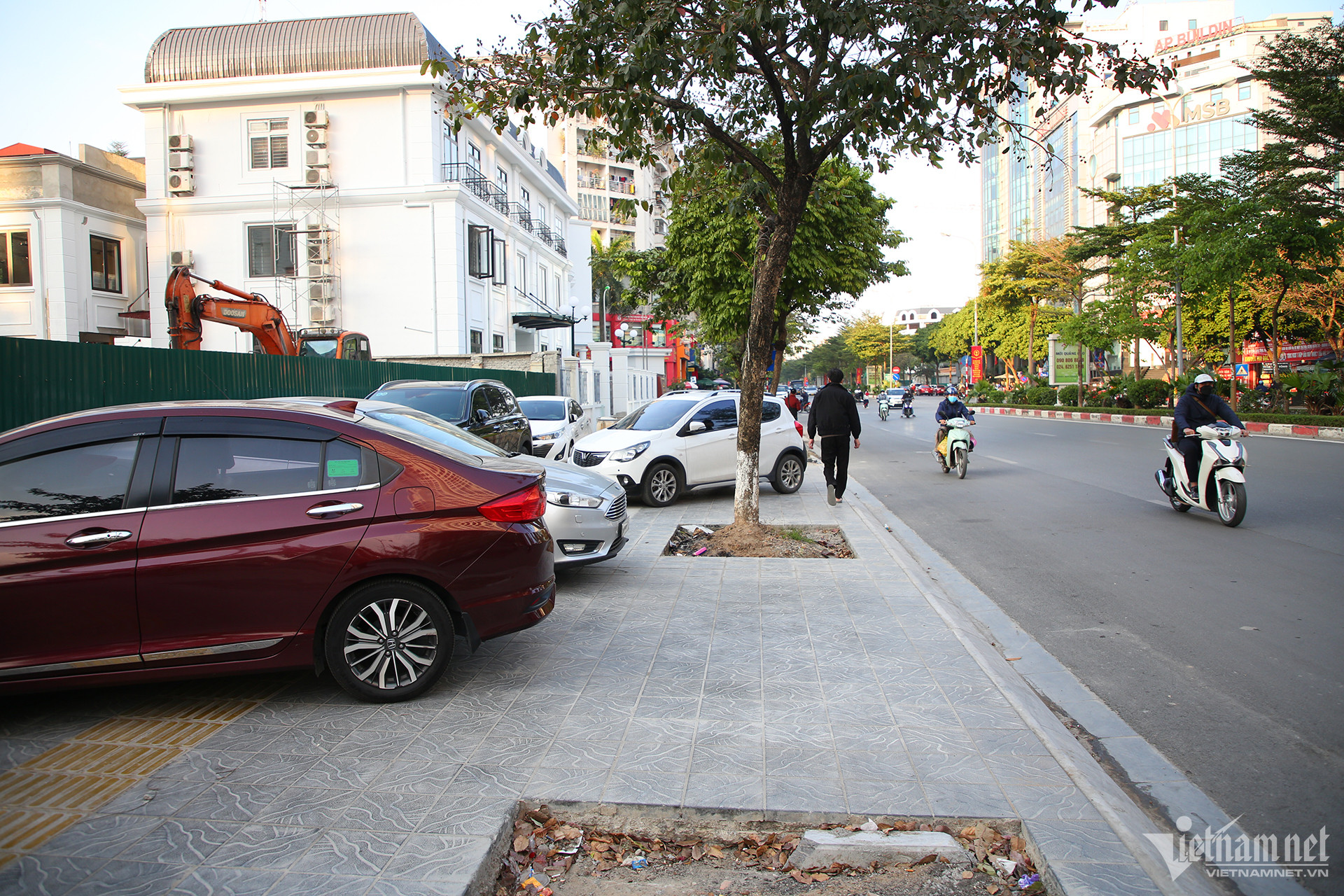 Thậm chí, tại phố Trần Thái Tông (quận Cầu Giấy), vỉa hè đang được thay đá lát dang dở đã có 10 ô tô đỗ ngổn ngang ở khu vực trước cửa số nhà 90 phố Trần Thái Tông.