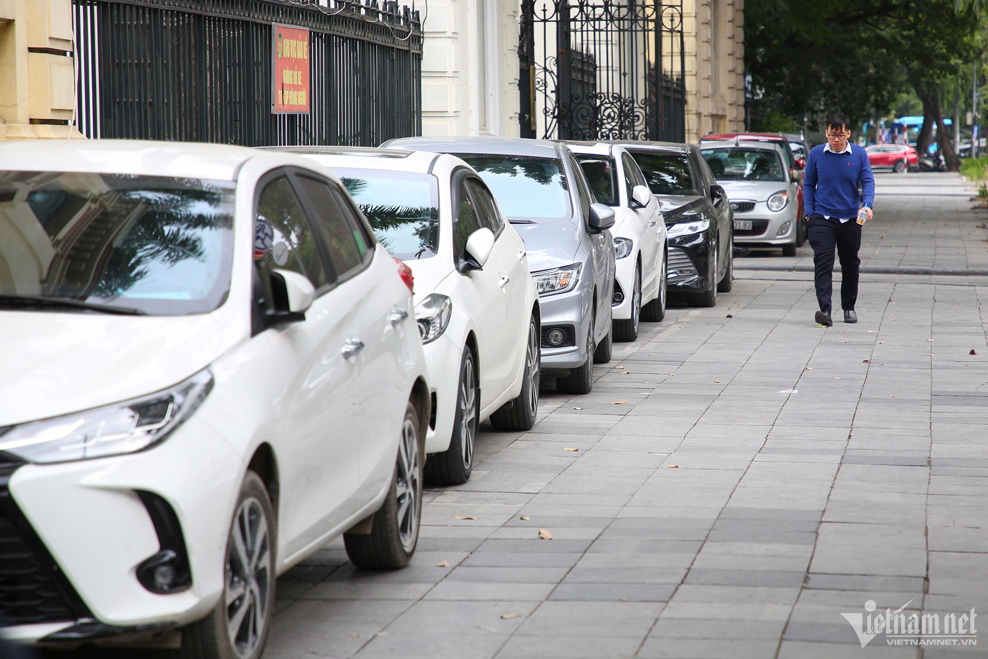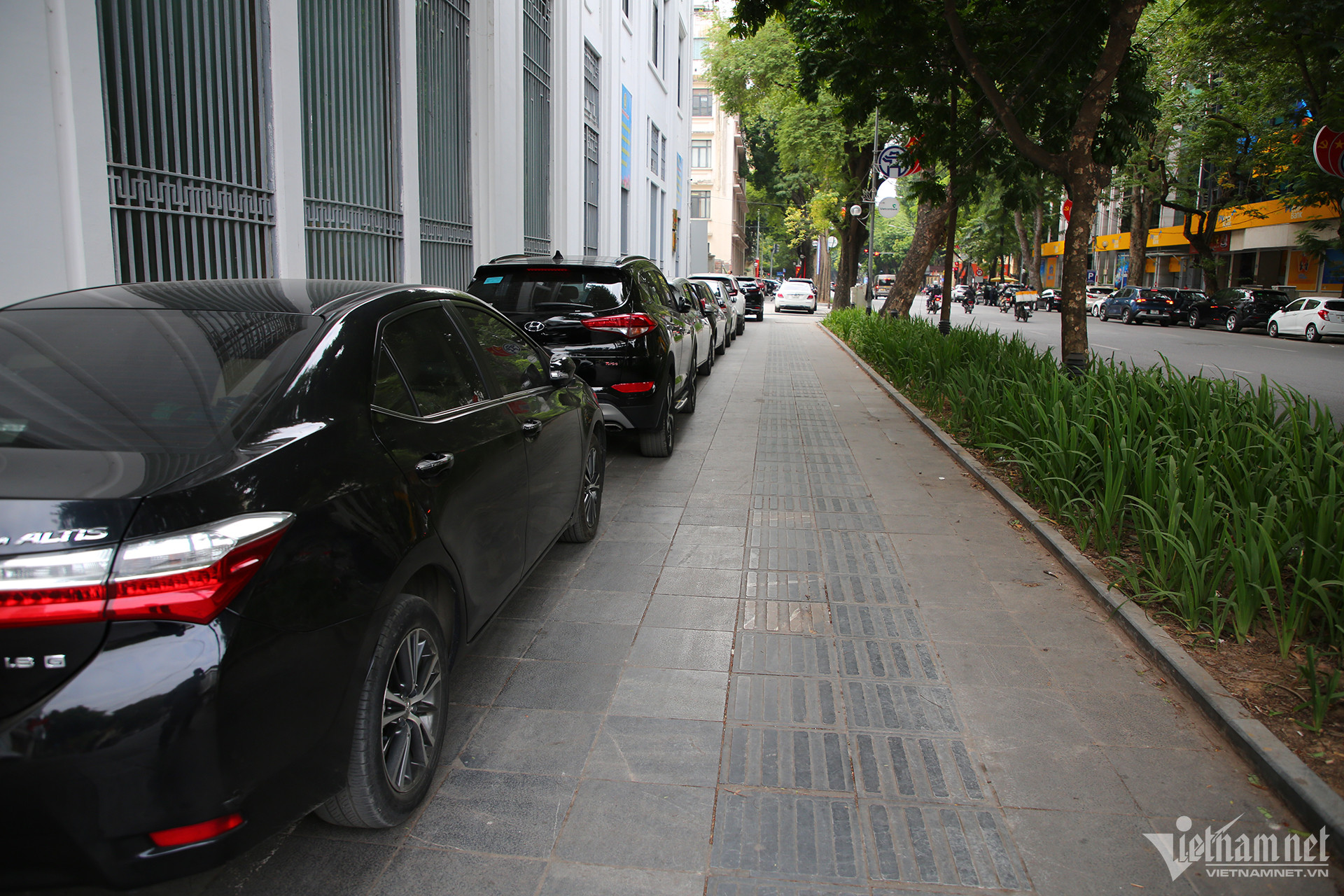 Trên vỉa hè phố Lý Thái Tổ (phường Lý Thái Tổ, quận Hoàn Kiếm) cũng có 20 ô tô đỗ. Người đi bộ tại đây gặp nhiều khó khăn khi phải luồn lách qua các hàng xe này.