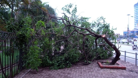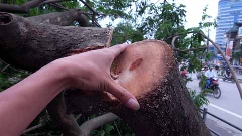| Cây sưa đỏ trên phố Lê Duẩn sau khi bị cưa và bỏ lại hiện trường. |