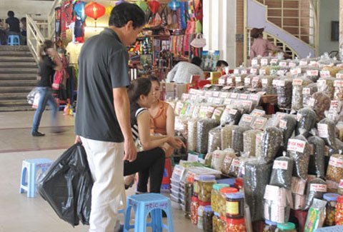Các sản phẩm đều để trong túi nylon hoặc hộp nhựa và có dán một miếng giấy nhỏ ghi tên mặt hàng chứ không ghi xuất xứ, thành phần... Theo lời giới thiệu của bà chủ quầy hàng 125, loại đào khô màu hồng đẹp mắt có giá 68.000 đồng/kg, loại mận khô có giá 58.000 đồng/kg.