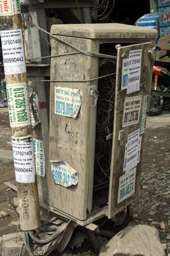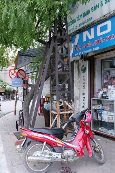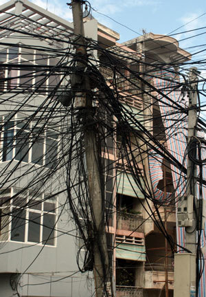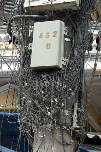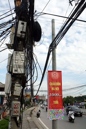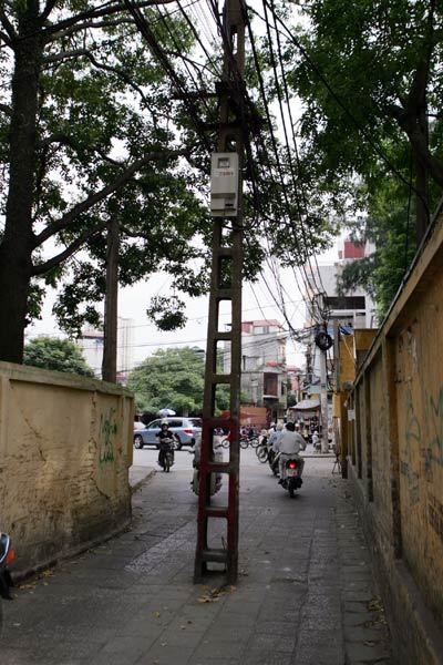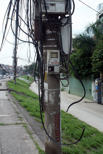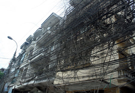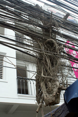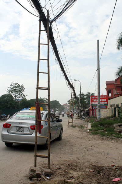 Dây nhợ nhằng nhịt, cột điện xiêu đổ, thậm chí có chỗ phải dùng cả thang tre để chống đỡ những búi rác trời lưu cữu đến mức cây cảnh mọc ngay lên đó được. Mỹ quan của Thủ đô Hà Nội quả là có một nét riêng kỳ lạ mà chẳng thủ đô nào trên thế giới sánh nổi!
