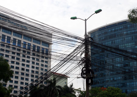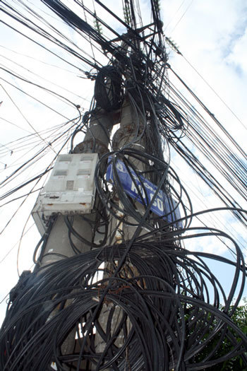 Không phải là vài chục loại dây cáp, mà là đến vài trăm loại dây: điện, điện thoại, cáp truyền hình, cáp viễn thông...cùng nhau hợp làm bẩn khoảng không Hà Nội. Sức nặng mà mỗi cây cột đèn, cột điện phải gồng gánh quá qui định 5-7 lần, nhưng những cây cột ấy muốn đổ cũng không được vì bị cáp chằng néo.