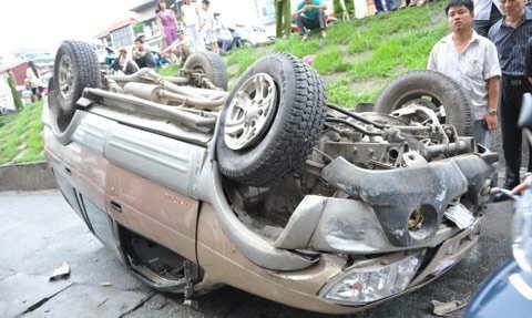 chổng vó dưới chân đê, phần đầu xe bị bóp méo, kính cửa trước và kính chắn sau