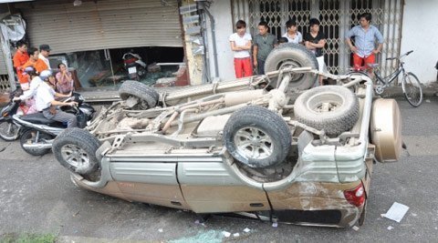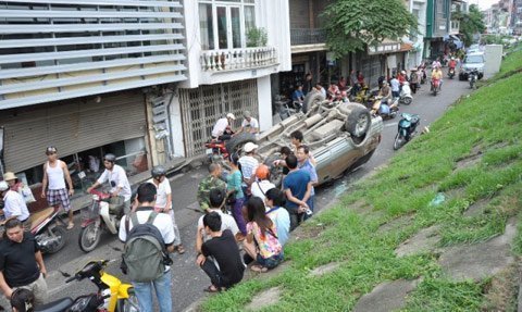 | Xế hộp nằm chổng vó dưới chân đê |