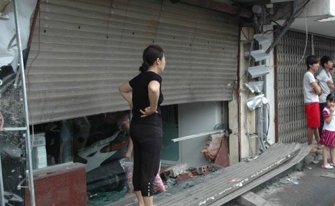 xe bị vỡ, nhiều mảnh kính mắn tung tóe khắp nơi. Phần cửa của số nhà 126 Nghi
