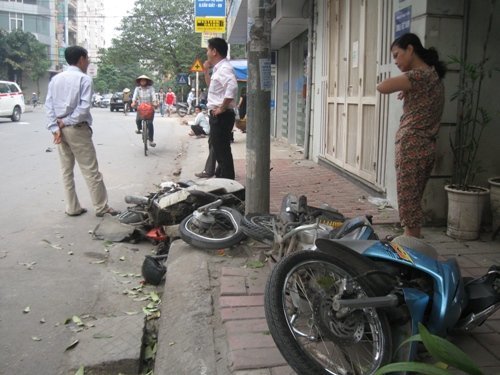 Theo ghi nhận tại hiện trường, hai chiếc xe máy Dream BKS: 29K8-4321 của gia định chị Thoa bị hư hỏng hoàn toàn, xăng chảy lênh láng, đầu xe rụng rời toàn bộ các bộ phận, bánh trước bị biến dạng…; Chiếc xe máy WaveS 110 BKS: 30K8-44.. của anh Khánh, khách đang uống nước tại quán nhà chị Thoa cũng hư hỏng rất nặng nằm bẹp bên mép đường, những mảnh nhựa vương khắp đường.