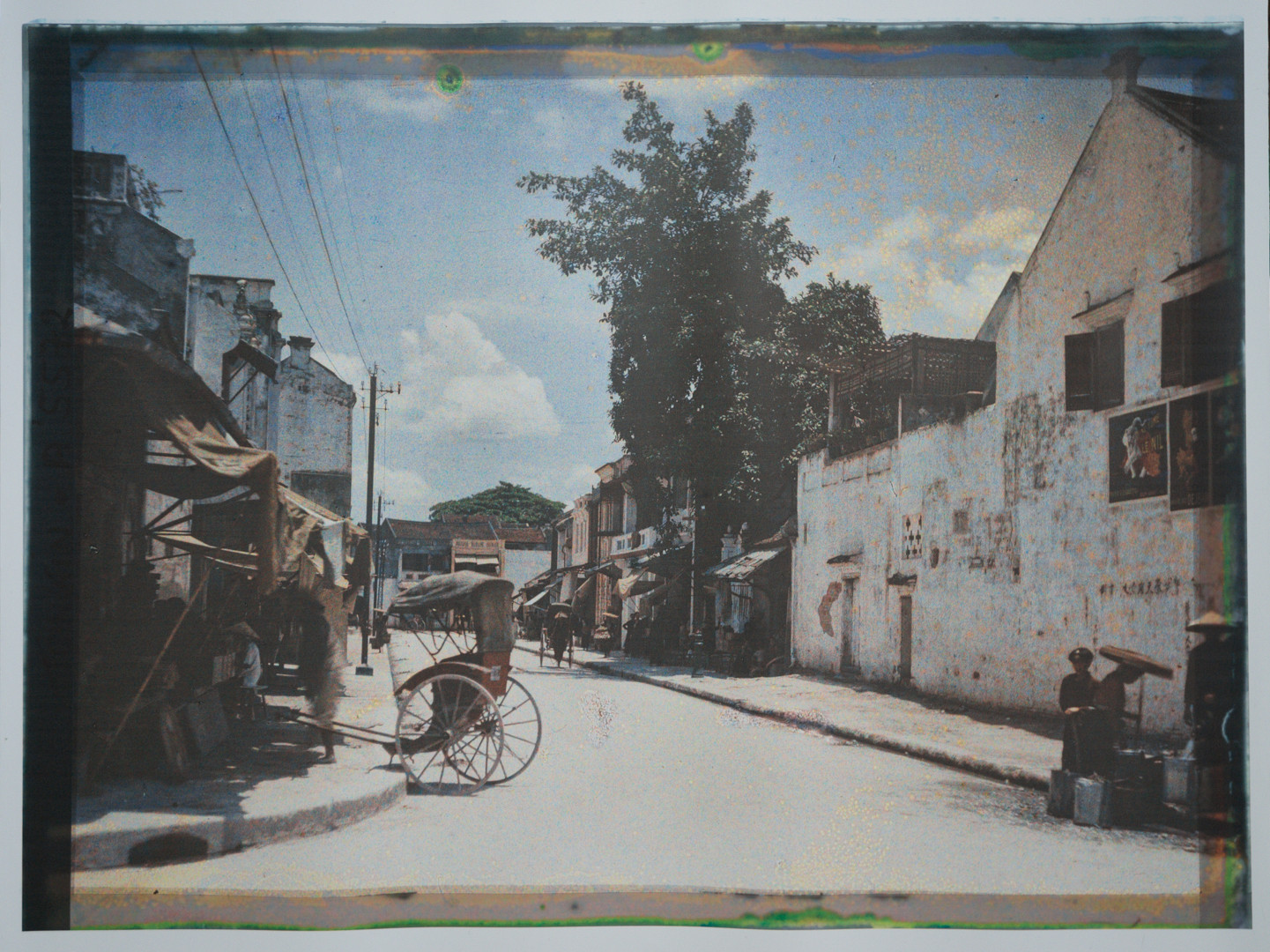 Những cửa hiệu và chiếc xe kéo tay trên phố Hàng Quạt. Vào đầu thế kỷ 20, ngày càng có nhiều sản phẩm nhập khẩu từ Pháp và châu Âu có mặt tại thị trường Việt Nam.