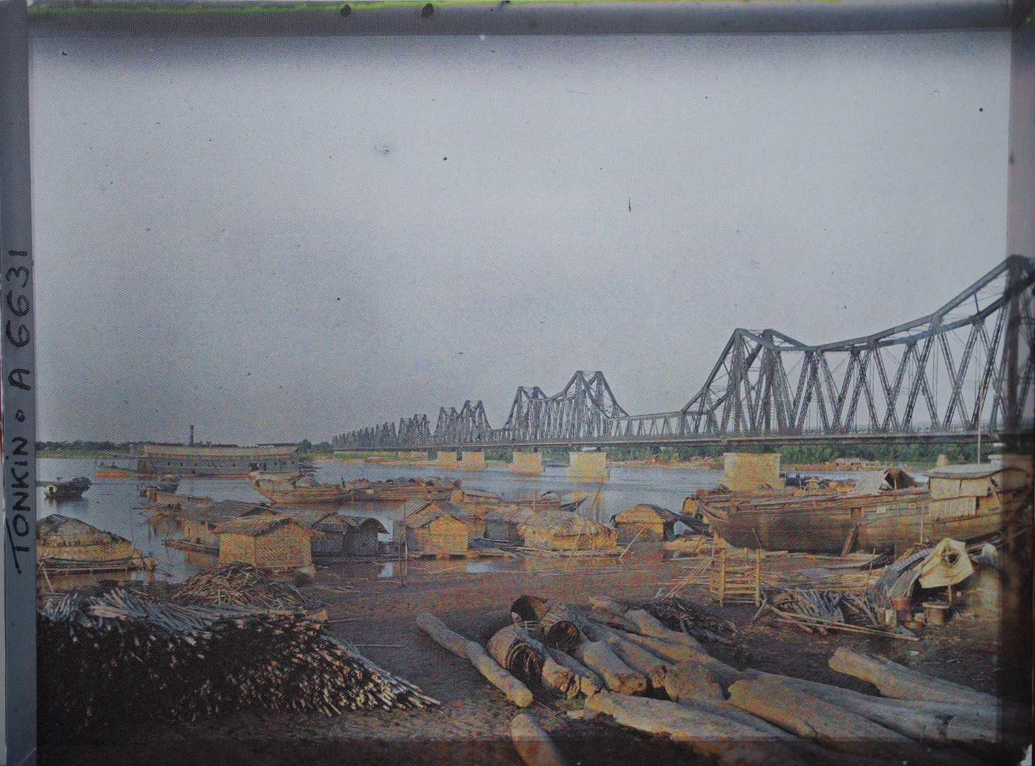 Thuyền bè bên bờ sông Hồng gần cầu Doumer (tức cầu Long Biên) lúc hoàng hôn. Khu vực bờ sông gần chân cầu được dùng làm nơi tập kết các mặt hàng các mặt hàng vật liệu để chuyên chở bằng đường sông. Công trình cầu Long Biên này ngoài việc là một kỳ tích thật sự về kỹ thuật (cây cầu dài nhất châu Á vào đầu thế kỷ 20) còn tạo nên sự thay đổi lớn trong mạng lưới giao thông ở miền Bắc Việt Nam thời bấy giờ.