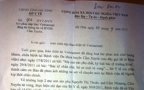 Tại công văn này, Sở Y tế cảm ơn báo VietNamNet đã phản ánh những sai sót về chuyên môn tại bệnh viện Cẩm Xuyên để ngành kịp thời chấn chỉnh.
